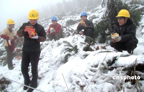2月3日,電力工人在搶修110KV線路。1月17日以來,四川瀘州敘永遭遇百年不遇的雨雪冰凍災(zāi)害,導(dǎo)致11萬千伏倒桿斷線2KM,10千伏斷線426KM,380伏斷線937KM,高壓倒桿142余根,低壓倒桿485余根,變壓器約25臺(tái)受損。為盡快搶通線路,電力工人們風(fēng)餐露宿、加班加點(diǎn)。 中新社發(fā) 黃虎 攝