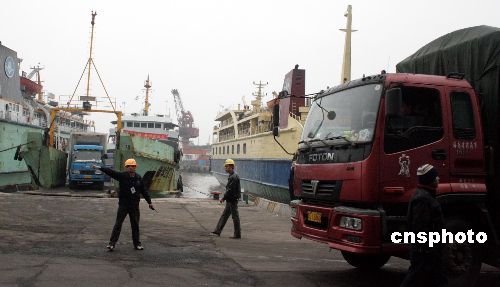 2月4日,海口港碼頭,出島和進島運輸冬季瓜菜在卡車接連不斷。長江中下游地區(qū)大量大棚蔬菜因雪災(zāi)凍死,位于熱帶的海南島成了名副其實的“中國菜籃子”。中國商務(wù)部、鐵道部、交通部三部委官員目前已聯(lián)合抵瓊,會商緊急調(diào)運海南冬季瓜菜,以保障雪災(zāi)災(zāi)區(qū)人民及港澳地區(qū)的蔬菜供應(yīng)。中新社發(fā) 關(guān)向東 攝