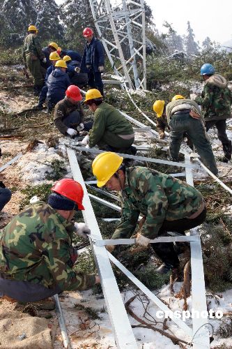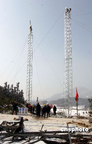 一座塔倒下去,又一座塔立起來,湖南望城縣橋驛鎮(zhèn)月塘村華沙線500千伏塔,電力工人羅海文、羅長(zhǎng)明、周景華不幸遇難的送變電倒塌電塔現(xiàn)場(chǎng),經(jīng)過湖南省送變電建設(shè)有限公司三分公司140多職工和120名武警官兵日夜搶修,2月3日,在原41號(hào)鐵塔的廢墟上立起了一座新塔。另外44、43號(hào)倒塌的鐵塔也在近日修復(fù)。中新社發(fā) 殷中民 攝