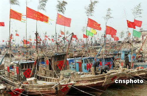 2月5日,在連云港市沿海漁村,漁民們沿襲傳統(tǒng)的漁家過年習(xí)俗。春節(jié)前,漁民在漁船上掛紅旗、貼財神、放鞭炮,插上寓意“搖錢樹”的毛竹,以祈福納祥,祈求來年新春漁業(yè)豐產(chǎn)豐收。中新社發(fā) 王健民 攝