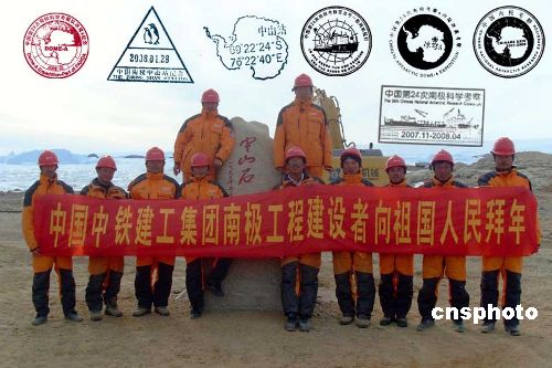 春節(jié)將至,隨中國第24次南極考察計劃在南極實施中山站建設(shè)工程的中國中鐵建工集團(tuán)11名職工,在中山站紀(jì)念碑前向祖國人民拜年。南極地理狀況復(fù)雜,基巖硬度高,凍土層深的條件下,每天工作16個小時以上,園滿的完成了各工程節(jié)點的任務(wù),被稱為“鐵軍”。中新社發(fā) 同德 攝