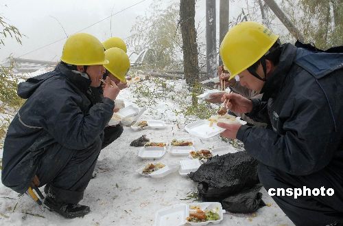 圖:浙江新昌縣供電局搶修現(xiàn)場(chǎng)員工的除夕午餐