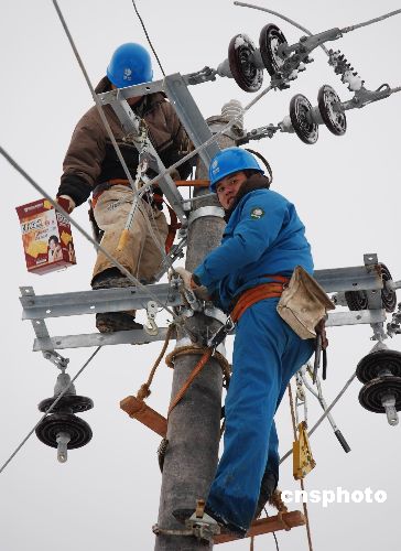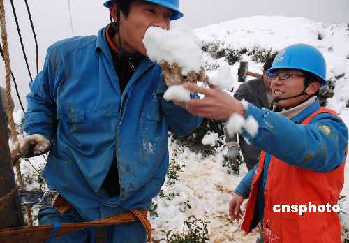 2月6日,電力搶修隊(duì)員在海撥600米的高山雪地里吃年夜飯。據(jù)悉,近日雪災(zāi)造成浙江嵊州21條主要供電線路中斷供電,該市供電局每天出動(dòng)500余人進(jìn)行抗災(zāi)自救。2月6日,該市供電局200多名黨員干部組成6支電力搶修突擊隊(duì)員,對(duì)該市貴門、里南、長樂3個(gè)未通電鄉(xiāng)鎮(zhèn)開展春節(jié)供電大會(huì)戰(zhàn),當(dāng)晚6時(shí)前,該市全面修復(fù)供電,實(shí)現(xiàn)新春零斷電。中新社發(fā) 張亮宗 攝