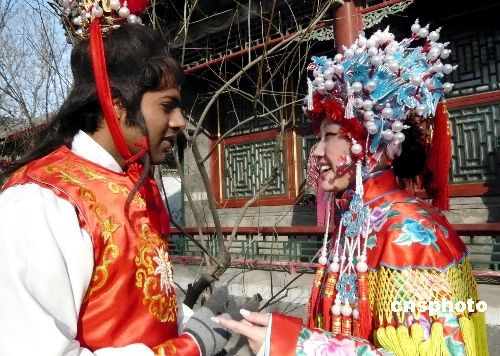 2月8日,由北京大觀園主辦的第十三屆紅樓廟會(huì)吸引眾多游客。在本屆廟會(huì)諸多活動(dòng)中,由印度青年扮裝的紅樓人物“賈寶玉”成為亮點(diǎn)。圖為“賈寶玉與林黛玉”亮相大觀園紅樓廟會(huì)。中新社發(fā) 錢興強(qiáng) 攝
