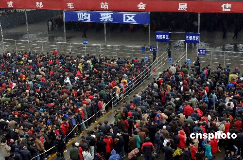 圖:成都站春運(yùn)臨時售票處向旅客售票