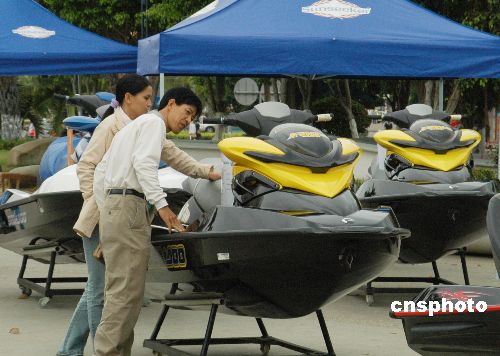 2月8日,游人在三亞鹿回頭廣場(chǎng)參觀豪華游艇。由三亞順業(yè)船舶設(shè)備有限公司和香港游艇廠商聯(lián)合舉辦的2008迎春游艇展覽會(huì)繼續(xù)在海南三亞鹿回頭廣場(chǎng)舉行,這是三亞首次舉行的大規(guī)模游艇展,展覽將持續(xù)到2月14日。所展出的圣斯克、夢(mèng)特威、斯莎等品牌的豪華游艇、摩托艇、快艇以及加拿大龐巴迪品牌旗下的快艇、雪地車、沙灘車等海上運(yùn)動(dòng)休閑娛樂產(chǎn)品,春節(jié)期間吸引諸多三亞市民和游客參觀。中新社發(fā) 尹海明 攝