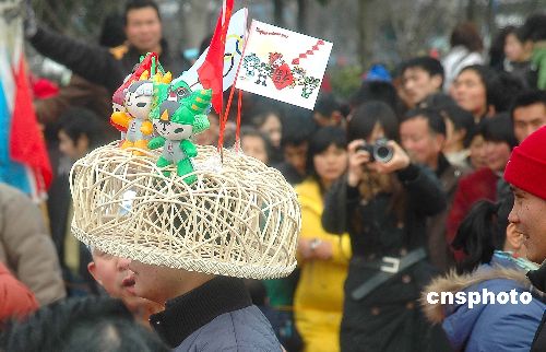 2月8日,一位頭頂“鳥巢”的市民出現在杭州公園,成為游人爭相追逐的“明星”。據悉,該帽是杭州市冬泳協(xié)會的杜仲明設計,請師傅用藤條做出的“鳥巢”,放上“五福娃”,特意為08新年冬泳“亮相”而裝扮。中新社發(fā) 引煒 攝