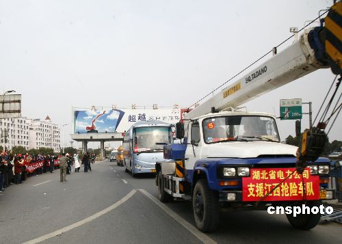 2月10日上午11時(shí)許,由171輛車組成的湖北支援江西電網(wǎng)的搶修車隊(duì)通過九江長江大橋抵達(dá)江西,搶修人員將趕赴咸夢線的搶修工地,修復(fù)咸夢線江西段134公里長受損電網(wǎng)。中新社發(fā) shendudu 攝
