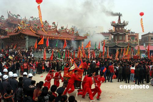 2月10日中午,廈門市同安區(qū)西柯鎮(zhèn)呂厝村四年一次民間民俗盛事--迎“王船”活動吸引了眾多的群眾。當(dāng)?shù)孛癖娦欧畹倪@個王爺叫“代天巡狩”。傳說“代天巡狩”神威顯赫,總能替天行道,愛護(hù)百姓,當(dāng)?shù)孛癖姸己芫囱鏊R蚨,到了新舊王爺?shù)慕唤幽辏?dāng)?shù)厝罕姸紩e行“送王”和“迎王”慶典,表達(dá)他們祈平安慶豐收的心情。通常,申子辰年(鼠、龍、猴年)為新舊王爺交接年,交接年間的正月初四為迎接新任王爺?shù)氖,同年的農(nóng)歷十月?lián)袢諝g送原任王爺,形成了四年一任的民間迎送王爺?shù)氖V行律绨l(fā) 吉辛 攝