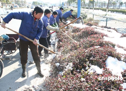 2月13日,江蘇宜興市綠化工人春節(jié)后上班第一天,清理道路綠化帶苗木上的積雪。今年受特大雪災影響,江蘇宜興市綠化帶中存留了大量積雪冰凍。中新社發(fā) 丁煥新 攝