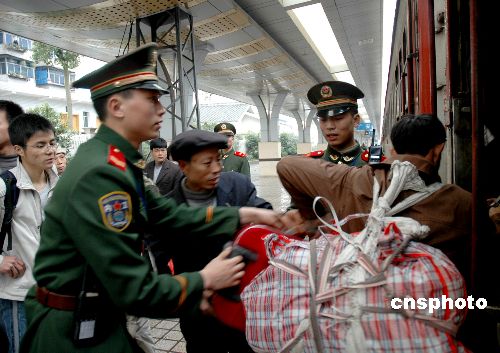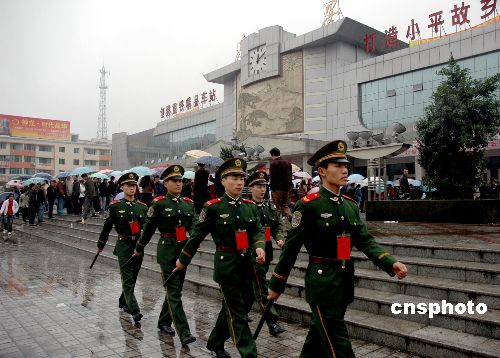 圖:武警在四川廣安火車站維護(hù)民工回流秩序