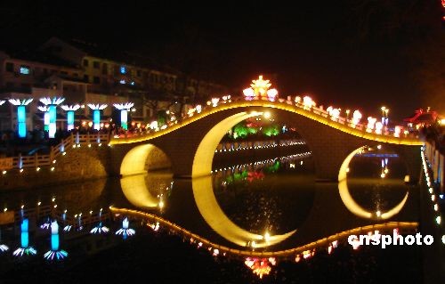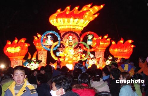2月19日,正月十三晚6時,江蘇儀征市華燈初放,古樓景觀區(qū)20多組彩燈在夜幕下交相輝映,顯得壯觀艷麗。當(dāng)晚儀征市10多人涌向燈展區(qū)觀燈。中新社發(fā) 黃建林 攝