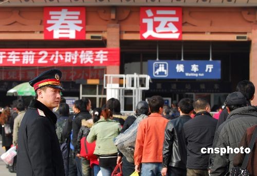 2月19日,旅客在西安火車站排隊有序進站乘車。元宵節(jié)將至,外出民工與返校學(xué)生流、探親流等客流全面啟動,西安火車站客流持續(xù)攀升。鐵路部門采取提前二小時進站、在廣場設(shè)立臨時候車區(qū)等措施,做好旅客乘車組織及服務(wù)工作,確?土鞲叻灏踩⑵椒(wěn)、有序。中新社發(fā) 唐振江 攝