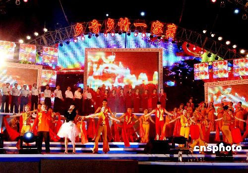 2月20日正月十四晚,前來(lái)參加“鄉(xiāng)音鄉(xiāng)情一家親”2008“兩馬同春鬧元宵”大型焰火文藝晚會(huì)演出的馬尾合唱團(tuán)、馬尾大頭娃娃表演隊(duì)與馬祖合唱團(tuán)、馬祖電音孩仔演出隊(duì)的成員共同上演開(kāi)場(chǎng)歌舞《今宵多美好》!皟神R同春鬧元宵”活動(dòng)已經(jīng)成功舉辦五屆。中新社發(fā) 劉可耕 攝