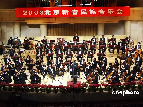 2月20日,2008北京新春民族音樂會在北京中山音樂堂舉行,1000多名奧運籌辦工作參與者觀看了演出。音樂會上,特別為迎接北京奧運會而創(chuàng)作的兩部交響作品《北京述說》、《呦噻2008》和琵琶協(xié)奏曲《弦上秧歌》首次公演。中新社發(fā) 追影 攝