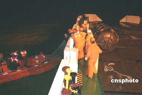 2月27日晚,一艘滿載950噸煤灰的“福順六號”貨輪在廈門鎮(zhèn)海角附近觸礁擱淺,導(dǎo)致船艙大量進(jìn)水,嚴(yán)重傾斜。經(jīng)過交通部東海救助局“東海救一三一”的全力救助,遇險船上8名船員全部獲救。圖為救助船施放救生艇把遇險船員安全轉(zhuǎn)送到“東海救一三一”輪。中新社發(fā) 東海 攝