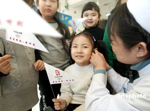 2月29日,河北滄州市人民醫(yī)院的醫(yī)護(hù)人員為幼兒園的兒童進(jìn)行聽力測試。為迎接第九次全國愛耳日,滄州市人民醫(yī)院耳鼻喉科的醫(yī)護(hù)人員結(jié)合主題“奧運(yùn)精神-我聽到”,組織了以“健康聽力,綠色奧運(yùn)”為口號的義診活動(dòng)。在為期半天的活動(dòng)中,醫(yī)護(hù)人員先后為100余名兒童進(jìn)行了聽力測試,并做了預(yù)防耳病基礎(chǔ)知識的宣傳。中新社發(fā) 郭金明 攝