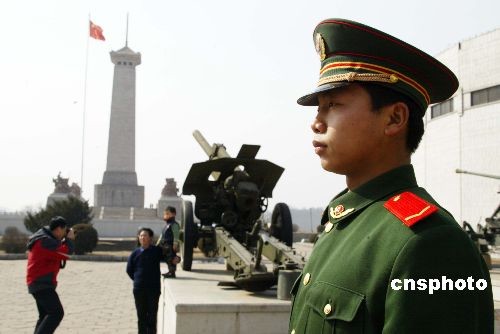 3月1日,丹東邊防檢查站的值勤戰(zhàn)士正在丹東抗美援朝紀(jì)念館執(zhí)行警衛(wèi)任務(wù)。作為遼寧省五家大型博物紀(jì)念館之一的抗美援朝紀(jì)念館當(dāng)天正式向公眾永久免費開放,有1000多名國內(nèi)外游客和市民進(jìn)入紀(jì)念館參觀。為紀(jì)念抗美援朝戰(zhàn)爭勝利55周年,紀(jì)念館建館50周年,展館新增設(shè)的專題展覽成為當(dāng)天開放接待參觀的亮點。中新社發(fā) 陳浩浩 攝