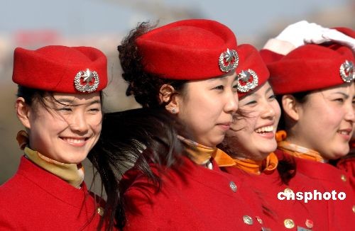 三月三日,北京天安門廣場,女服務(wù)員笑容燦爛迎“兩會”。當(dāng)日下午,全國政協(xié)十一屆一次會議在北京人民大會堂隆重開幕。中新社發(fā) 王東明 攝