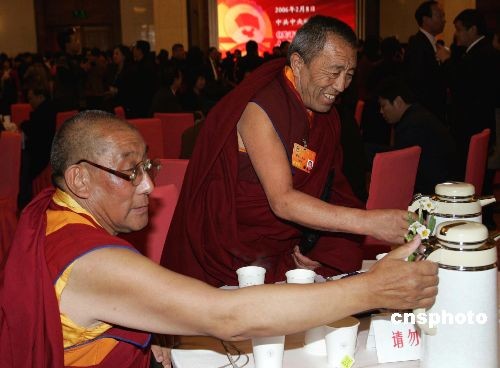 三月三日下午,全國(guó)政協(xié)十一屆一次會(huì)議在北京人民大會(huì)堂隆重開幕,來自西藏的全國(guó)政協(xié)委員在會(huì)場(chǎng)喝到可口的茶水,深感“賓至如歸”。中新社發(fā) 潘索菲 攝