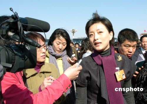 圖為政協(xié)委員楊瀾接受記者采訪。3月3日下午,中國人民政治協(xié)商會(huì)議第十一屆全國委員會(huì)第一次會(huì)議在北京人民大會(huì)堂開幕。委員們積極參政議政、獻(xiàn)言獻(xiàn)策,進(jìn)出人民大會(huì)堂時(shí)被中外記者團(tuán)團(tuán)圍堵。中新社發(fā) 毛昭勝 攝