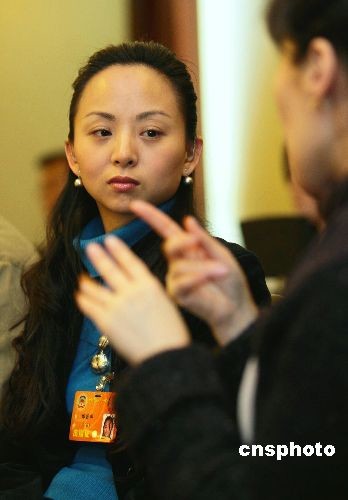 3月5日,全國政協(xié)十一屆一次會議進行政府工作報告小組討論。以“千手觀音”舞蹈揚名天下的邰麗華委員在文藝界小組討論中,通過手語翻譯與其他委員交流。邰麗華是中國殘疾人藝術團藝術總監(jiān)。中新社發(fā) 盛佳鵬 攝