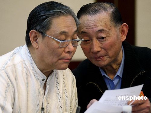 3月5日下午,全國(guó)政協(xié)十一屆一次會(huì)議進(jìn)行政府工作報(bào)告小組討論,梅蘭芳大師之子梅葆玖(右)與京劇名家張學(xué)津參加文藝小組討論。梅葆玖任北京京劇院梅蘭芳京劇團(tuán)團(tuán)長(zhǎng)。張學(xué)津是北京京劇院一級(jí)演員。中新社發(fā) 盛佳鵬 攝