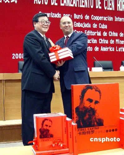 三月七日,古巴領(lǐng)袖菲德爾·卡斯特羅中文版自傳《卡斯特羅訪談傳記:我的一生》首發(fā)式在北京中國(guó)社科院舉行,他親自為該書撰寫了序言《致中國(guó)人民》,并在其中表示“在二十一世紀(jì)的世界形勢(shì)下,應(yīng)該依靠中國(guó)”。圖為中國(guó)社科院副院長(zhǎng)王偉光向古巴駐華大使卡洛斯·米格爾·佩雷拉贈(zèng)送中文版自傳。中新社發(fā) 應(yīng)妮 攝