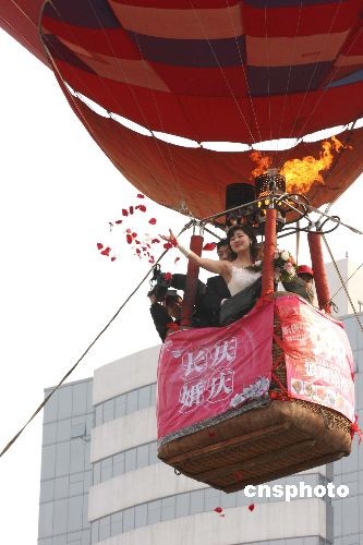 3月8日,鄭州一對(duì)情侶乘坐熱氣球升空舉辦空中婚禮,隨著熱氣球的徐徐上升,空中的新娘手提花籃向下拋灑玫瑰花,新郎頻頻的向地上的親朋好友揮手致意,在熱氣球上,他們異口同聲的大聲呼喚:“祝天下的女士婦女節(jié)快樂(lè)”。中新社發(fā) 王中舉 攝