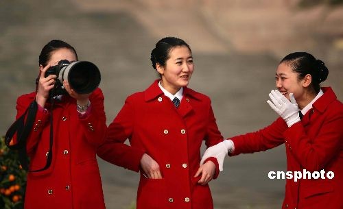 三月十日上午,十一屆全國人大一次會議在北京人民大會堂舉行第三次全體會議,三名兩會女服務(wù)人員在會場外好奇試用攝影記者的重“武器”。中新社發(fā) 盛佳鵬 攝