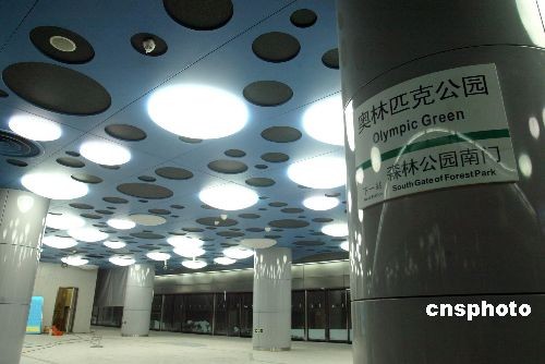 北京地鐵“奧運支線”裝飾工程近日進入收尾階段。該支線是北京地鐵線網(wǎng)中直接為奧林匹克中心區(qū)服務(wù)的骨干軌道交通線路,正線全長4.398公里,連接著奧林匹克中心站、奧林匹克公園站。圖為建在奧運會主場館“水立方”之下的奧林匹克公園站,設(shè)計風(fēng)格融入諸多“水元素”。中新社發(fā) 富田 攝