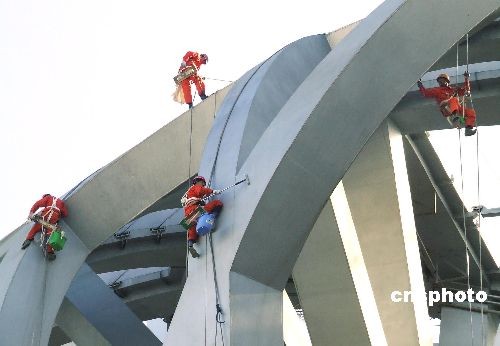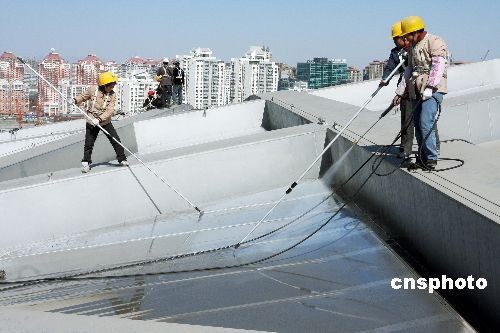 3月13日,中國國家體育場“鳥巢”開始“洗臉美容”。據北京城建集團國家體育場工程總承包部消息,此次清洗是為了迎接4月中旬的“好運北京”測試賽!傍B巢”膜結構近92000平方米,在膜結構清洗的同時還進行鋼結構保潔。圖為工作人員正在對“鳥巢”進行鋼結構保潔。中新社發(fā) 鄭雄增 攝