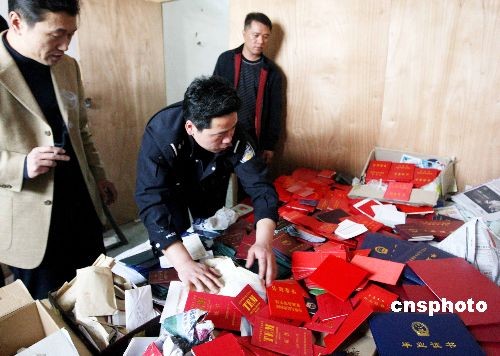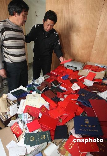 3月19日,河南洛陽警方在一民宅內將一伙制造假證的犯罪集團逮個正著。行動中查獲各類假證7大類145種共計10000多份,現(xiàn)場還查獲印章、鋼印、電腦、打印機等一批制假造假設備。在事實面前,犯罪嫌疑人對犯罪事實供認不諱。中新社發(fā) 曾憲平 攝