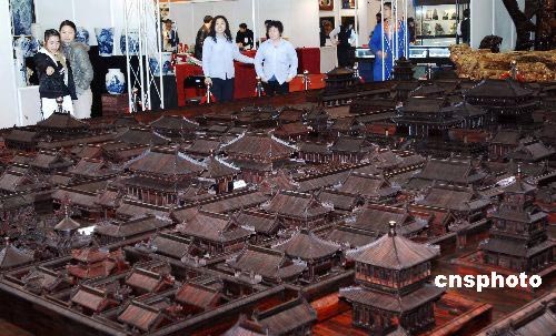 3月20日,為期5天的“第六屆全國工藝品、旅游品、禮品博覽會(huì)暨第十一屆春季(大連)中國古玩藝術(shù)品博覽會(huì)”在大連星海會(huì)展中心舉行。在展會(huì)西廳區(qū),一個(gè)一展現(xiàn)古都風(fēng)貌喜迎2008年奧運(yùn)會(huì)為創(chuàng)作宗旨的按正式比例縮小120倍的紫檀巨雕故宮全景,吸引了眾多市民的眼球。這個(gè)作品9米長,寬7米,總面積60余平方米,由50余位高級(jí)技師歷時(shí)6年精心雕制而成。該作品無論從用料、耗時(shí)都令人稱絕。如此大型紫檀木雕藝術(shù)作品也實(shí)屬罕見。中新社發(fā) 劉德斌 攝