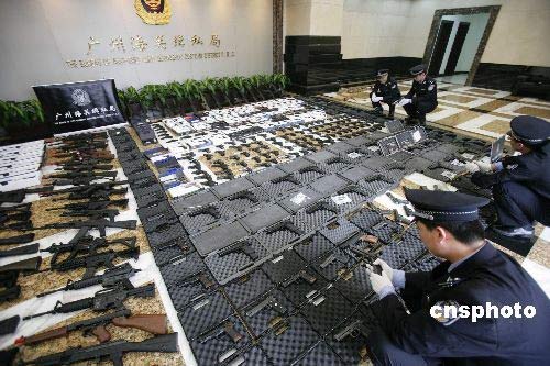 3月21日消息,廣州海關緝私局宣布,兩年前經(jīng)過艱苦偵查,成功破獲了一個專門從事走私仿真槍的犯罪團伙,該起案件案值逾五百萬元人民幣,走私進口數(shù)量逾三千支。近日,廣州市中級人民法院對該案作出一審判決:以走私普通貨物罪分別判處譚某等十名被告有期徒刑六年到二年不等。圖為2006年破案后,海關關員清點走私仿真槍支。中新社發(fā) 陳國華 攝