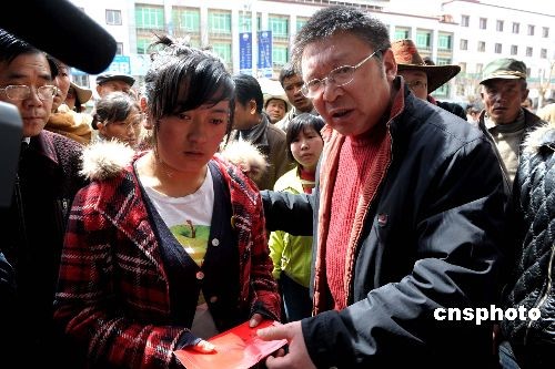 3月22日,拉薩一服裝店門前,中國新聞社西藏分社社長柳俊武向受害者卓嘎捐助善款。在拉薩3月14日發(fā)生的打砸搶燒破壞活動中,該服裝店的五名女員工被活活燒死在店中,卓嘎是當時的幸存者。中新社發(fā) 廖攀 攝