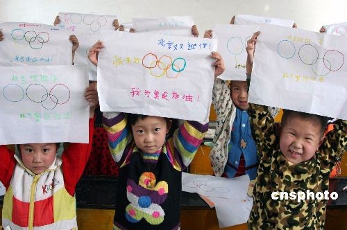 4月7日,邢臺(tái)博文幼兒園的小朋友展示自己畫(huà)的奧運(yùn)標(biāo)志。今年以來(lái),該園讓孩子們學(xué)習(xí)奧運(yùn)、社會(huì)和家庭禮儀,訓(xùn)練他們?cè)谌粘I钪械奈拿鲉?wèn)候、待客等良好習(xí)慣,教育孩子們爭(zhēng)做禮儀小使者,文明奧運(yùn)宣傳員。 陳雷 攝