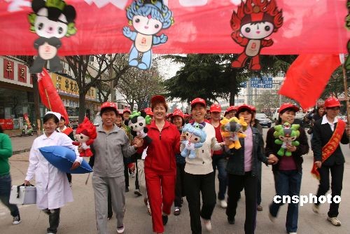 4月7日,河南南陽(yáng)市臥龍區(qū)60多位社區(qū)大媽以慢跑形式,迎接北京奧運(yùn)會(huì)。本次名為“春暖花開迎奧運(yùn)”的慢跑活動(dòng),總路程為五公里,大媽們以飽滿的精神、驕健的步伐充分釋放喜迎奧運(yùn)的激動(dòng)心情。中新社發(fā) 付海厚 攝