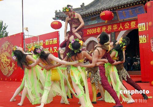22日,第四屆伏羲文化旅游節(jié)在“羲皇圣里”河北省新樂(lè)市開(kāi)幕。來(lái)自美國(guó)、加拿大、臺(tái)灣、香港等國(guó)家和地區(qū)的萬(wàn)余名華人代表、學(xué)術(shù)社團(tuán)代表、伏羲文化專家、易學(xué)專家、各地客商及當(dāng)?shù)孛癖婟R聚“伏羲臺(tái)”,舉行2008年世界華人公祭人文始祖伏羲大典。新樂(lè)自古有“羲皇圣里”之稱,商周以來(lái),這里就是世界華裔同胞尋根祭祖的圣地,每年陰歷三月十八的伏羲廟會(huì),香火鼎盛,連綿不絕,延續(xù)至今。圖為祭祀大典當(dāng)中的樂(lè)舞告祭。中新社發(fā) 牛琳 攝