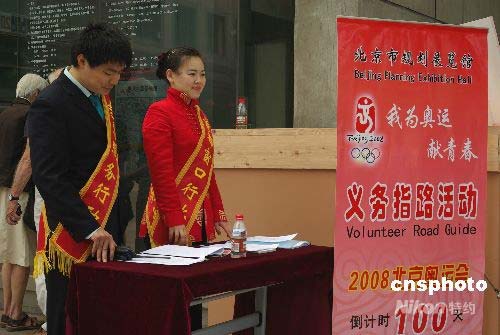 4月29日,在北京奧運(yùn)會(huì)倒計(jì)時(shí)100天即將到來(lái)之際,北京市規(guī)劃展覽館在前門(mén)東大街開(kāi)展“我為奧運(yùn)獻(xiàn)青春 義務(wù)指路活動(dòng)”,為國(guó)內(nèi)外游客提供義務(wù)指路服務(wù)。中新社發(fā) 九州 攝