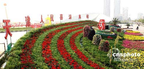 4月30日,天津市有關(guān)部門在銀河廣場(chǎng)擺放的以“天津人民喜迎奧運(yùn)”為主題的巨型花壇亮相,使銀河廣場(chǎng)更靚,給即將到來(lái)的“五一”節(jié)增添了歡樂(lè)、祥和和喜慶氣氛。中新社發(fā) 李勝利 攝