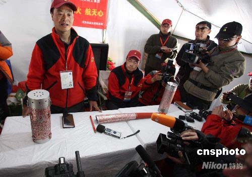 4月30日,受邀采訪2008北京奧運(yùn)會(huì)火炬接力珠峰展示活動(dòng)的中外媒體記者,集體在珠峰大本營(yíng)探營(yíng)。中國(guó)航天科工集團(tuán)北京奧運(yùn)火炬研發(fā)部有關(guān)負(fù)責(zé)人,向中外媒體揭秘奧運(yùn)火炬接力珠峰展示活動(dòng)所使用的珠峰火種燈、珠峰火炬、珠峰引火器。中新社發(fā) 盛佳鵬 攝