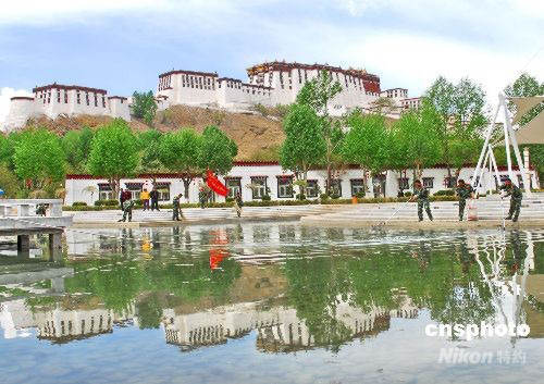“五一”期間,駐西藏武警官兵在拉薩市布達拉宮廣場、公園、街道等公共場所為城市“美容”,為迎接北京奧運圣火進藏、振興藏區(qū)旅游做貢獻。中新社發(fā) 張權 攝