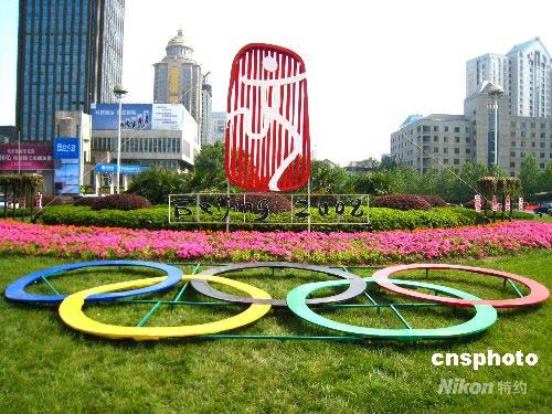 近日,隨著奧運圣火“祥云”在國內(nèi)的傳遞,南京街頭、公園、學校喜迎奧運的氛圍也越來越濃。圖為園林部門在鼓樓廣場利用花草樹木和奧運會會徽、奧運五環(huán)組成的奧運主題中心花園成了十分醒目的靚麗景觀。中新社發(fā) 谷昌旺 攝