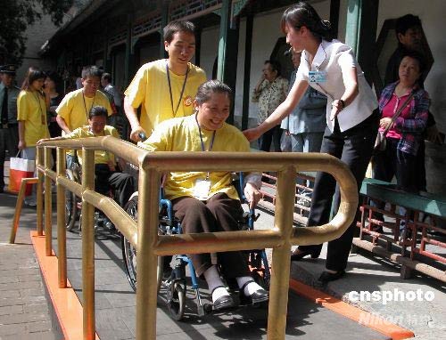 5月8日,60多名殘疾人在志愿者“一對一”的照顧下,來到北京頤和園感受古老皇家園林的魅力,更體驗(yàn)現(xiàn)代無障礙設(shè)施帶來的便捷。頤和園近日修筑了兩條總長約10公里的環(huán)形無障礙旅游線路,將經(jīng)過公園內(nèi)25處最著名景點(diǎn)。在兩條環(huán)形通道行進(jìn)方向還安裝了42塊無障礙導(dǎo)向指示牌,殿堂區(qū)安裝了16處無障礙坡道,建造了殘疾人獨(dú)立衛(wèi)生間7處,裝有自動開關(guān)電動門及自動報(bào)警裝置,其余的衛(wèi)生間也全部設(shè)有殘疾人設(shè)施。園內(nèi)還增設(shè)了3處殘疾人專用電話亭。圖為殘障人士在志愿者的協(xié)助下通過無障礙坡道。 中新社發(fā) 杜燕 攝
