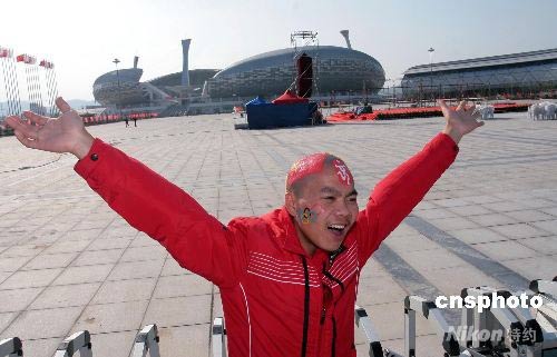 5月11日,奧運(yùn)圣火在福建泉州傳遞的前一天,一名僑鄉(xiāng)青年特地剃了個(gè)2008奧運(yùn)個(gè)性發(fā)型,來(lái)到火炬?zhèn)鬟f泉州終點(diǎn)站——海峽體育中心,提前感受奧運(yùn)激情。中新社發(fā) 傅丹丹 攝