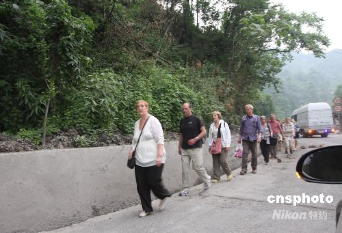 5月12日14時28分,在四川汶川縣(北緯31度,東經(jīng)103.4度)發(fā)生7.8級地震。都江堰至汶川路段的水井灣大橋,發(fā)生約一百米寬的山體滑坡,已導(dǎo)致都江堰至汶川路段完全中斷,不少游客徒步數(shù)小時向都江堰方向前行,其中包括一些外國游客。中新社發(fā) 黃榮 攝