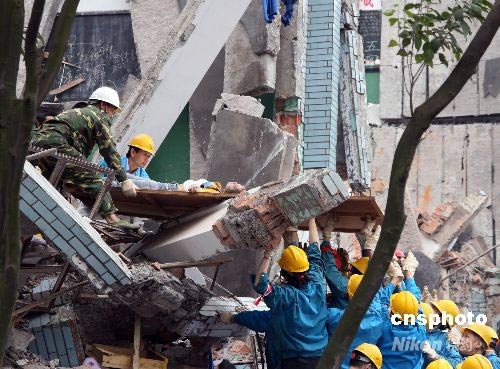 5月13日中午,四川省綿竹市漢旺鎮(zhèn)東方汽輪機(jī)廠子弟學(xué)校——東汽中學(xué)的垮塌校舍里,被困近一天的學(xué)生被救出。12日,四川汶川縣發(fā)生7.8級(jí)地震,而漢旺鎮(zhèn)與汶川僅一山之隔,距離30余公里,受到嚴(yán)重破壞。中新社發(fā) 郭晉嘉 攝