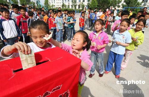 5月13日,新疆哈密新華私立學(xué)校開(kāi)展向四川汶川地震災(zāi)區(qū)捐款活動(dòng),得到孩子們的積極響應(yīng),學(xué)生們踴躍為地震災(zāi)區(qū)捐款獻(xiàn)愛(ài)心。中新社發(fā) 普拉提 攝