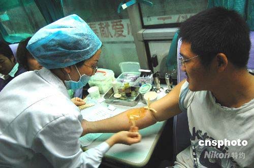 5月14日,重慶市西南大學育才學院近500名同學冒著大雨排隊獻血。重慶市合川區(qū)血液中心來到校園進行采集血液,引起了大量學生的踴躍報名獻血,場面一度失控。同學們血脈相通汶川,紛紛表示了對災區(qū)人民的慰問之情。血液中心負責人介紹說,當天采集了200余名學生的血液,將馬上運送到最需要的災區(qū)。中新社發(fā) 許康平 攝